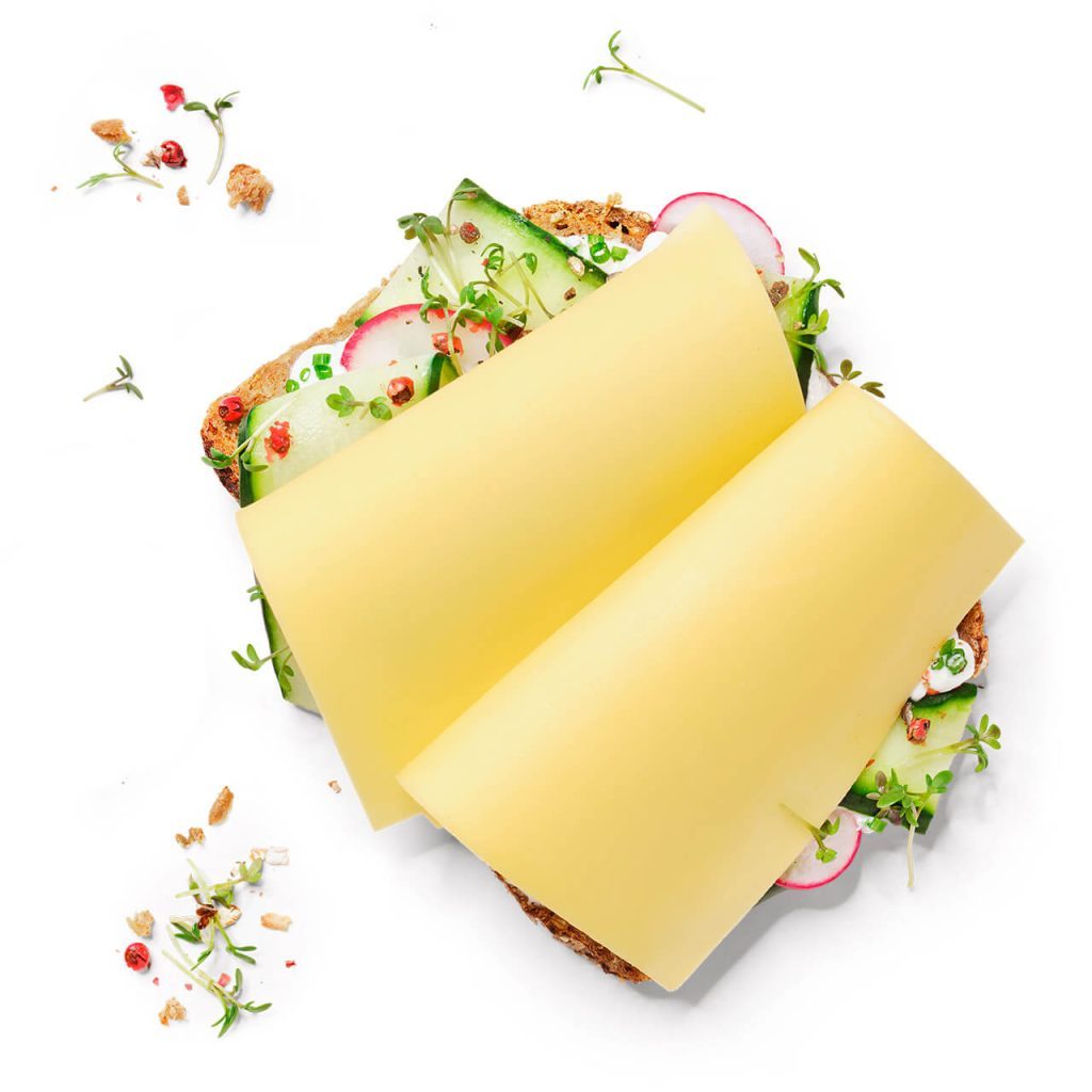Vegan sliced cheese substitute based on coconut oil. 100% plant-based. Enriched with Calcium and Vitamin B12.